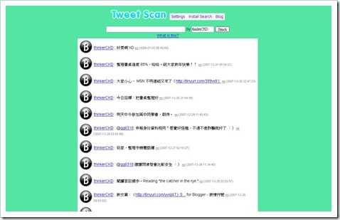 對了,可以點選Tweet scan首頁中的Install Search,即能安裝Tweet scan的搜尋外掛到FireFox上面唷。