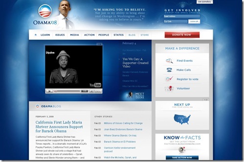 沒錯,整個網站給我們的就是一種「科技感」。跟歐巴馬的競選策略有所相輔,主要是針對年輕人來設計的。甚至有意的把歐巴馬朔造造成一項與 iPod 類似的品牌。