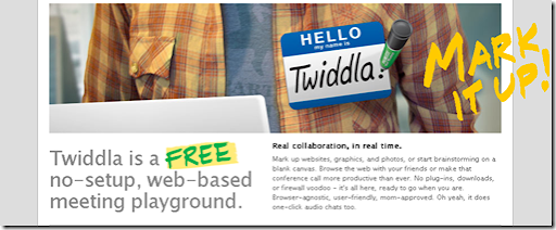 這個網站的初始概念應該是在「線上會議」。說到線上會議,也許朋友們會聯想到許多種型態。包括了視訊會議呀,甚至是MSN、即時通等等即時通訊軟體上面的會議室功能。不過這些都不是Twiddla的全貌,Twiddla最主要的特色是能夠讓使用者們一同瀏覽某一個網頁,然後可使用工具在上面標記。就如同Twiddla首頁上面的三個大黃字「MARK IT UP !」。