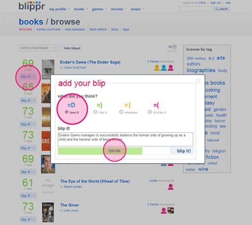 筆者認為,這樣的一個以「推薦」為基礎的網站,是可以適當的參考一下前輩書籤網站的經驗的。書籤網站會遇到的問題,Blippr也都有可能遇到。例如說,被推薦的商品類別與類別之間的不平衡。